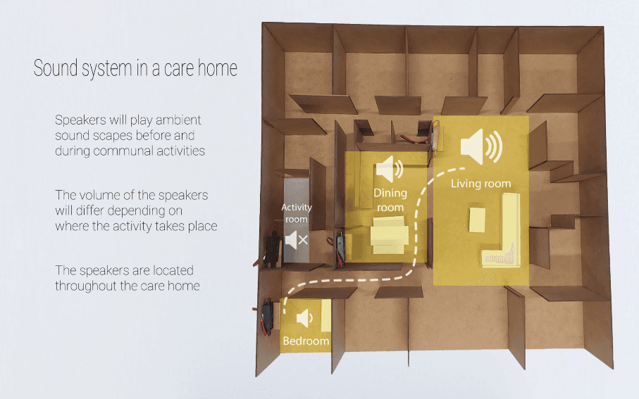 In the Netherlands, 80,000 people suffering from dementia live in a care home. All their monotonous structure in daily life is guided by caregivers. This makes the patients dependent, their brains inactive, and their cognitive decline worse. To solve this, we designed an ambient sound system that plays soundscapes to improve the independence of the residents.